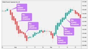 A Heikin Ashi chart shows a trend’s direction through its color-coded candles. A green candle is telling you that the trend is UP. A red candle is telling you that the trend is DOWN. A Heikin Ashi chart shows the trend’s strength by observing the shadows (or wicks). There is no lower shadow or wick for many of the green candles. Vice versa for the red candles. Most do not have any upper shadows or wicks. These candlesticks do not show a shadow in the opposite direction of the trend. When there is no shadow, this means you’re in a strong trend. So, the main thing you want to look for on a Heikin Ashi chart to determine trend strength is shadowless or wickless candlesticks opposite the trend.