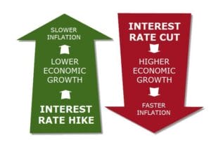 Central banks will likely increase interest rates to keep inflation comfortable, resulting in lower overall growth and slower inflation. This occurs because setting high-interest rates typically forces consumers and businesses to borrow less and save more, damaging economic activity. Loans just become more expensive while sitting on cash becomes more attractive. On the other hand, when interest rates are decreasing, consumers and businesses are more inclined to borrow (because banks ease lending requirements), boosting retail and capital spending, thus helping the economy to grow.