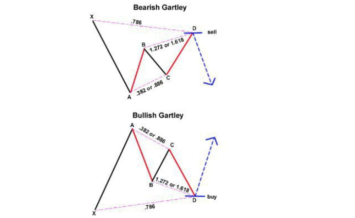 The Gartley pattern includes the basic ABCD pattern we’ve already discussed but is preceded by a significant high or low. These patterns usually form when the overall trend is corrected and looks like ‘M’ (or ‘W’ for bearish patterns). These patterns help traders find good entry points for the overall trend. A Gartley form is when the price action has been going on a recent uptrend (or downtrend) but has started to show signs of a correction.