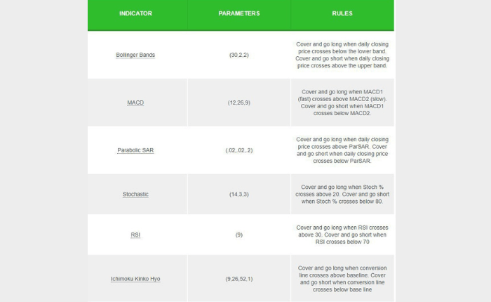 After all, forex traders don’t include these technical indicators just to make their charts look nicer. Traders are in the business of making money! If these indicators generate signals that don’t translate into a profitable bottom line over time, then they’re simply not the way to go for your needs! In order to give you a comparison of the effectiveness of each technical indicator, we’ve decided to backtest each of the indicators on their own for the past 5 years. Backtesting involves retroactively testing the parameters of the indicators against historical price action. You’ll learn more about this in your future studies. For now, just take a look at the parameters we used for our backtest.